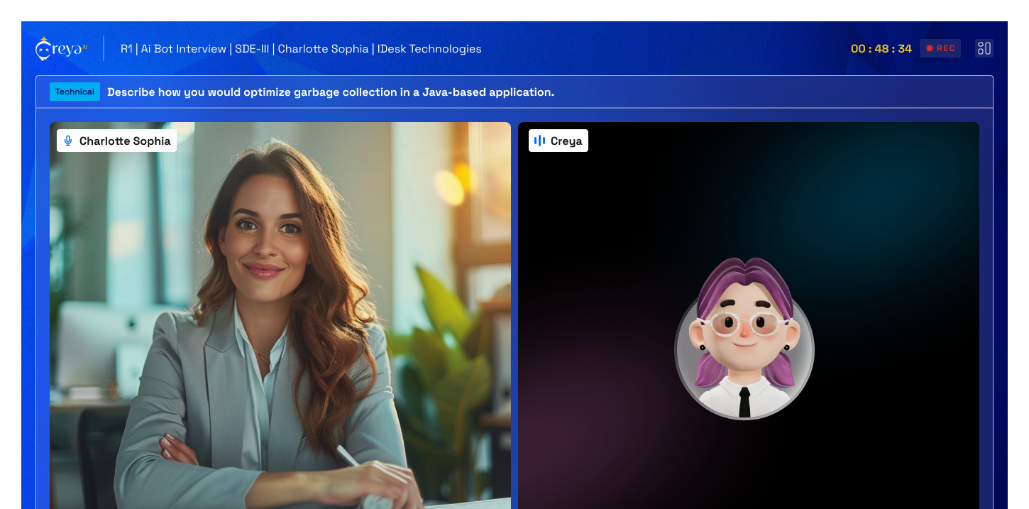 Candidates engage with Creya’s conversational interface, answering personalized questions that reflect their skills, experience, and cultural fit.